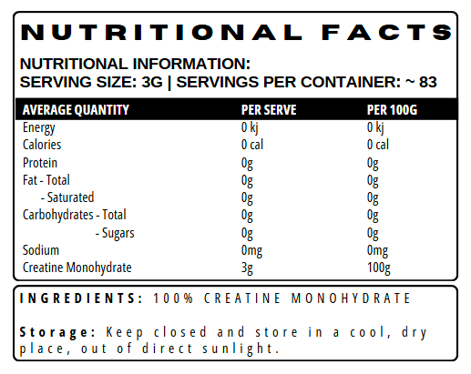 Each serving is 3g of 100% micronized creatine monohydrate — pure, unflavoured, and highly bioavailable.